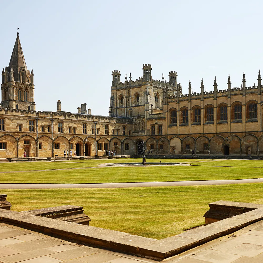 Christ Church College was established in 1525 by Cardinal Thomas Wolsey as Cardinal College on lands that had belonged to the Priory of St. Frideswide, the patron saint of Oxford. In 1529, however, the college building was abandoned in an unfinished state after Wolsey’s fall from Henry VIII’s favor. It was refounded by Henry VIII in 1546, the same year that he founded Trinity College in Cambridge. The college is named for Christ Church Cathedral, one of the smallest cathedrals in England, which serves as the college chapel as well as the cathedral of the Oxford diocese.
